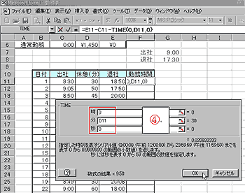 C休憩の数値を時刻のシリアル値に変換するため、分に休憩のセルDの4番地を選択、「OK」ボタンをクリックする。 |
