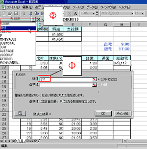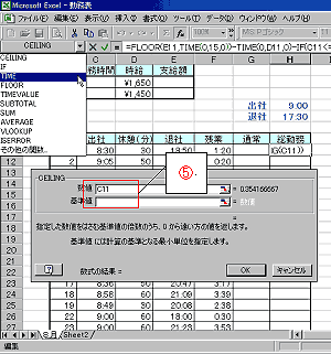 @数値ボックスには、退社時間のセルEの11番地を選択、基準値ボックスをクリック。 A関数ボックスから「TIME」関数を選択。