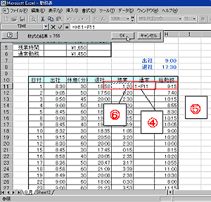 D総勤務のセルHの11番地を選択、「−」を入力。 E残業のセルFの11番地を選択して確定する。 |