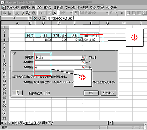 A論理式には、退社時間が出社時間より早かった場合という条件を設定するために、「E4<C4」と設定、真の場合には、早かった場合、24時間をたすので、24時間を表すシリアル値である「1」を入力、そうでなかった場合、そのままなので、「0」と入力。 |