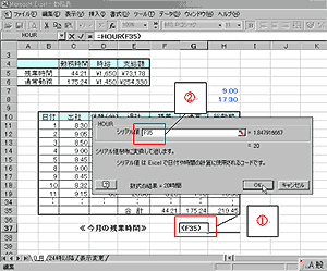 | 「8:35」といった時刻表示は、エクセルでは連続する数値(シリアル値)として管理されている。このシリアル値から1時間単位の「時間数」だけを抽出するのがHOURという関数。ここでは残業時間の合計の「8:35」から時間部分の「8」時間だけを抽出している | |||||