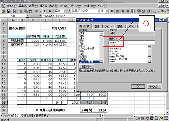 24時間を超えた計算を正しく行うには? @合計のセルを範囲選択、右クリック、セルの書式設定ダイアログを選択、「表示形式」タブのユーザー定義で時間を表す、「h」を[ ]でくくる。これにより、24時間を越えても24時間が省かれずに正しく表示される。 |