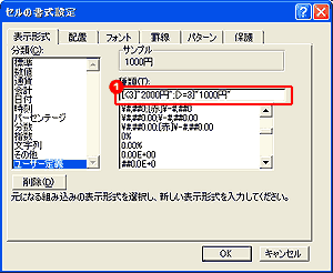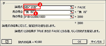 1.条件は[ ]でくくり、条件に合った場合にセルに表示させる値を""で囲んで入力する。 すると、3未満の数値を入力すると、2000円と表示され、3以上の数値を入力すると、1000円と表示される。 |