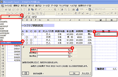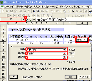 1.年会費を求めたいセルJの5番地を選択、IF関数を選択、 2.論理式のボックスをクリックし、利用者が子供であった場合という条件を付けるので、「H5="子供"」と入力。 3.[真の場合]には、子供であった場合、無料なので、「無料」と入力、 4.[偽の場合]には、子供でない場合、もう1つ条件が必要なので、ボックスをクリックし、 5.IF関数をネストする。 |