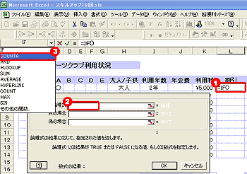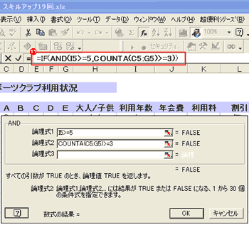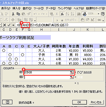 6.[論理式1]のボックスに、1つ目の条件である、利用年数が5年以上であった場合という条件式「I5>=5」を設定する。 7.[論理式2]のボックスには、2つ目の条件である、種目が3つ以上であった場合という条件式を設定するので、関数ボックスから[COUNTA]関数を選択する。 |