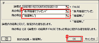 12.[真の場合]には、条件に合った場合、セルに表示させる値を入力するので、「毎月抽選でプレゼント」と入力、[偽の場合]には、条件に合わない場合なので、「抽選無し」と入力。 13.[OK]ボタンをクリックすると、求める事ができる。 |