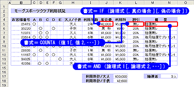 | 条件によって処理を変えられるのがIF関数。ここではH5に入った値が大人か子供かを判断し、子供ならば「無料」と表示させ、大人の場合は、利用年数によって会費を変更するように設定している。 | |||||