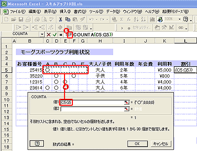 | データが入ったセルを数えるのがCOUNTA。数値が入ったセルを数えるならCOUNT。ここではIFとCOUNTA関数を組み合わせ、C〜G列に入った「○」印が2個以上なら20%引き、それ以外なら「無し」と表示。 | |||||