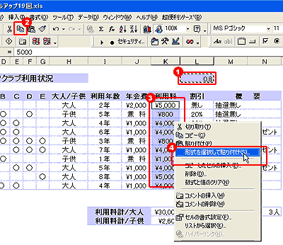 ◇■ 利用料を割引後の料金に置き換える ■◇ 通常、割引後の利用料を求める場合、数式を利用すると、別のセルに答えを求める事になってしまう。しかし、形式を選択して貼り付け機能を利用すると、四則計算しながら貼り付ける事ができるので、利用料を計算後の利用料に置き換える事ができる。