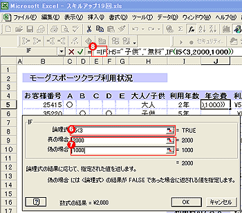6.条件には、利用年が3年未満であった場合という条件「I5<3」を入力、 7.[真の場合]には、そうであった場合なので、「2000」と入力、[偽の場合]には、そうでない場合なので、「1000」と入力する。ここでOKボタンクリックすると、求められるが、 8.数式バーをクリックして、IF関数に戻って数式を確認してみる。 |