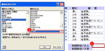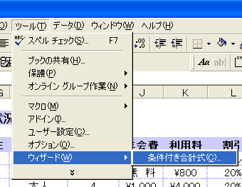 「条件付き合計式ウィザード」は、ウィザードを指定するだけで、複数の条件がつけられる。しかし、AND条件しかつけることができない。また、リスト内にセルの結合や、ユーザー定義で表示形式を設定しているとうまく認識されない。利用する前に、それぞれを外しておくことが必要。 |