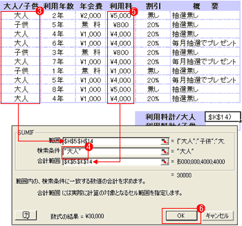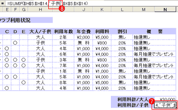 | 合計を求めるSUMと条件を設定するIFが組み合わさった関数。条件にあったセルだけを抽出し、合計を求めることができる。ここでは大人の場合と子供の場合の手数料(K列)を抽出し、それぞれ合計額を出している。 | |||||