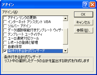 【サンプルデータ シート20-2】 [ツール(T)] メニューから [アドイン(I)] を選択し、(このときCD-ROMから必要なデータをインストールするように求められる事もあります。指示に従ってCD-ROMをセットしてください) 1. [条件付き合計式ウィザード] にチェックを入れて 2. [OK] ボタンをクリックする。 |