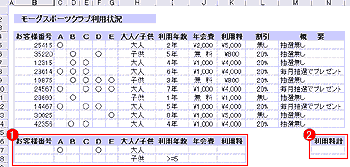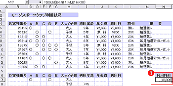 M列「概要」には、IF関数を使い、利用年数が5年かつA〜Eコースまでで3コース以上選択しているなら、「毎月抽選でプレゼント」、それ以外なら「抽選無し」と表示するよう設定している。式は「=IF(AND(I5>=5,COUNTA(C5:G5)>=3),"毎月抽選でプレゼント","抽選なし")」 |