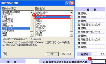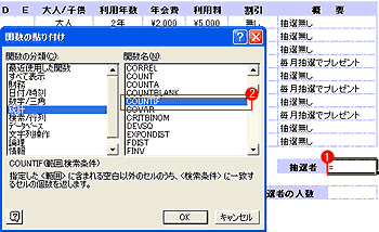 | セル範囲に含まれる数値の個数を数えるCOUNTとIFが組み合わさった関数。これによって条件にあったセルの個数を数えることができる。ここではM列に「毎月抽選でプレゼント」と入っているセルの個数を数えている。 | |||||