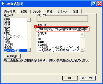 サンプルデータでは20-5シートのM5セルの書式設定に、[<10000]5桁入力必須;[>50000]未登録番号と設定。 |