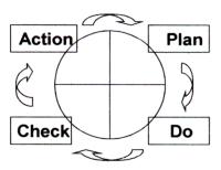 TQC(総合的品質管理)活動 1.組織作り→2.品質の定義→3.幹部教育→ 4.ポリシー宣言→5.QC教育→ 6.実践→7.診断→8.反省・是正・歯止め *1-8のPDCAを回しながら推進する |